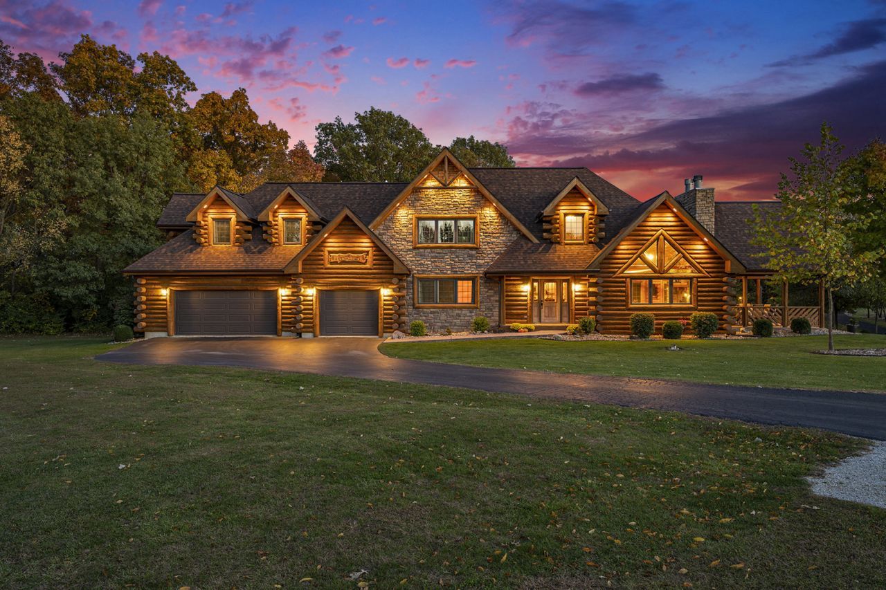 Welcome to this extraordinary Emerald Grand custom-built log estate, where timeless craftsmanship meets modern luxury. Perfectly situated on 2 serene acres surrounded by mature trees, shimmering ponds, and resort-style amenities, this property offers the ultimate retreat experience. Step inside to a grand open-concept design with soaring ceilings, rich wood finishes, and a true lodge-like ambiance. The gourmet kitchen is a chef's masterpiece, featuring custom cabinetry, stone countertops, premium stainless-steel appliances, and a spacious island ideal for entertaining. The expansive great room centers around a stunning stone fireplace and opens to multiple decks overlooking your private oasis. The finished walkout basement elevates entertaining with a full bar and private movie theater. Outdoors, enjoy a sparkling pool, covered patio with fireplace, and endless views of nature and wildlife. The property also includes a heated 28x48 insulated outbuilding with concrete floors and an upper loft-perfect for additional storage or creative space. Offering a rare combination of luxury, tranquility, and privacy, this remarkable home must be seen to be fully appreciated. Your private retreat awaits.